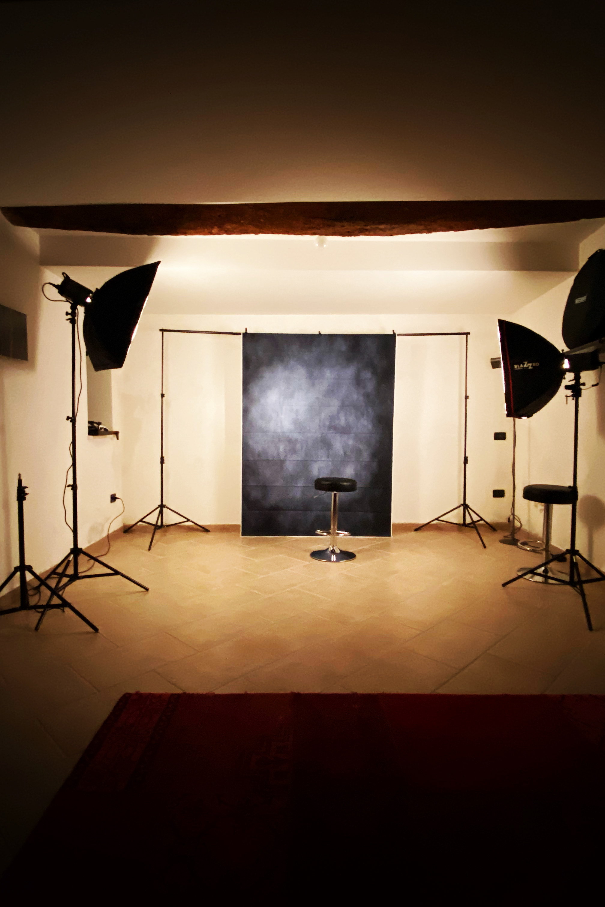 La sala pose è dotata di 3 flash fissi da 350W l'uno, tutti dotati di riflettori, softbox con attacco Bowens. In aggiunta sono disponibili 3 flash portatili a batteria da poter posizionare ancor più liberamente per dar sfogo alla creatività.